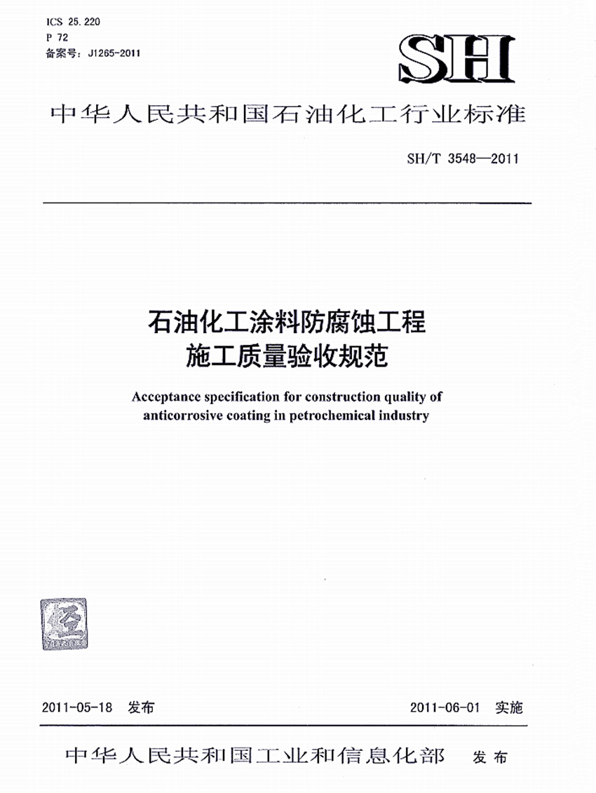 石油化工涂料防腐蝕工程施工施工質(zhì)量驗(yàn)收規(guī)范標(biāo)準(zhǔn)SH/T 3548-2011 ICS25.220 P72 備案號:J1265-2011 SH 中華人民共和國石油化工行業(yè)標(biāo)準(zhǔn) SH/T 3548-2011石油化工涂料防腐蝕工程施工施工質(zhì)量驗(yàn)收規(guī)范 Acceptance spccificatinon for construction quality of anticorrosive coating in