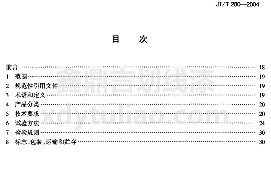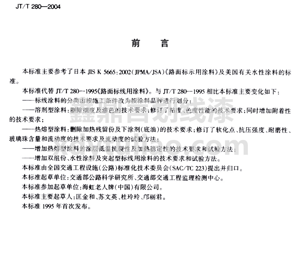 JT/T 280-2004路面標線涂料標準是小編照搬JT/T 280-2004《路面標線涂料》紙質版內容,大家可以放心參考。更多防腐涂料執行國家和行業標準等防腐涂料相關信息可以參與網站:m.wzyahu.com.cn