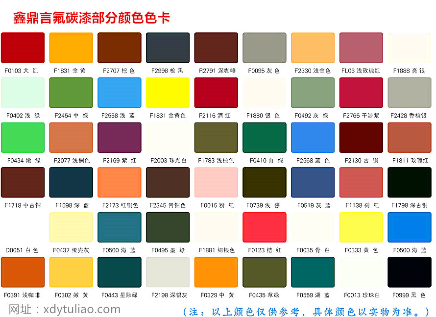 調色:氟碳漆顏色可按照防腐漆色卡(勞爾RAL色卡),標準色卡(國標色卡)選色定做。亦可以按照客戶樣板定做。