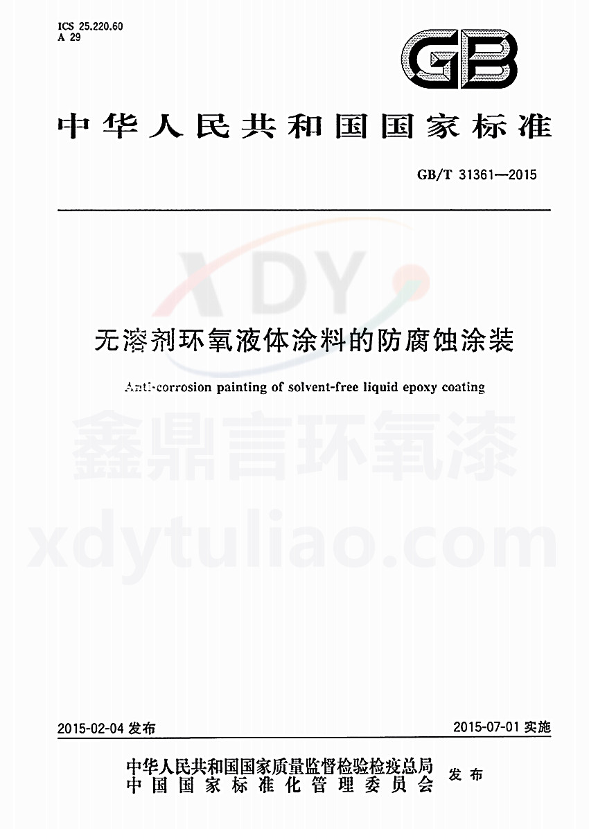 GB/T 31361-2015無溶劑環氧液體涂料的防腐蝕涂裝標準 ICS25.220.60 A29 GB 中華人民共和國國家標準 GB/T 31361-2015 無溶劑環氧液體涂料的防腐蝕涂裝anti-corrosion painting of solvent-free liquid epoxy coating 2015-02-04發布 2015-07-01實施 中華人民共和國國家質量監督檢驗檢