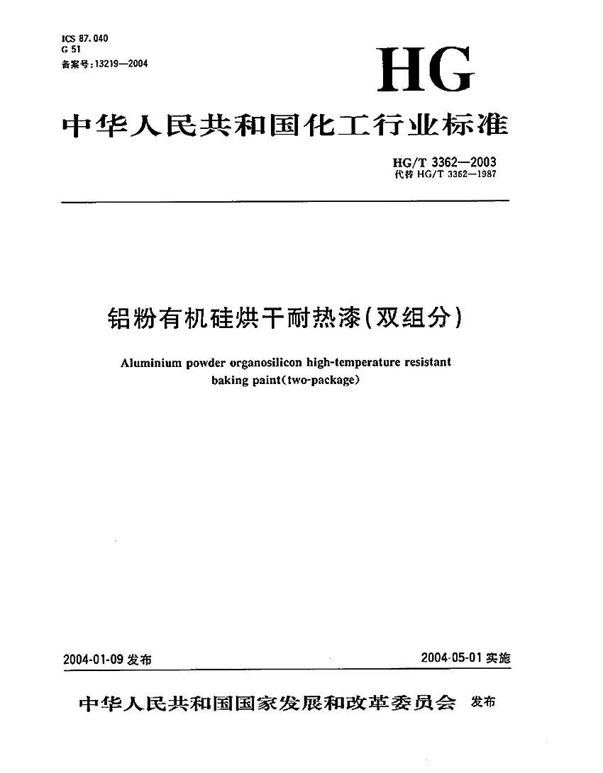 有機(jī)硅耐高溫漆標(biāo)準(zhǔn)HG/T3362-2003 ICS 87. 040 G 51 備案號(hào):13219-2004 HG 中華人民共和國(guó)化工行業(yè)標(biāo)準(zhǔn) HG/T 3362-2003代替 HG/T 3362-1987 鋁粉有機(jī)硅烘干耐熱漆(雙組分) Aluminium powder organosilicon high-temperature resistant baking paint(two-
