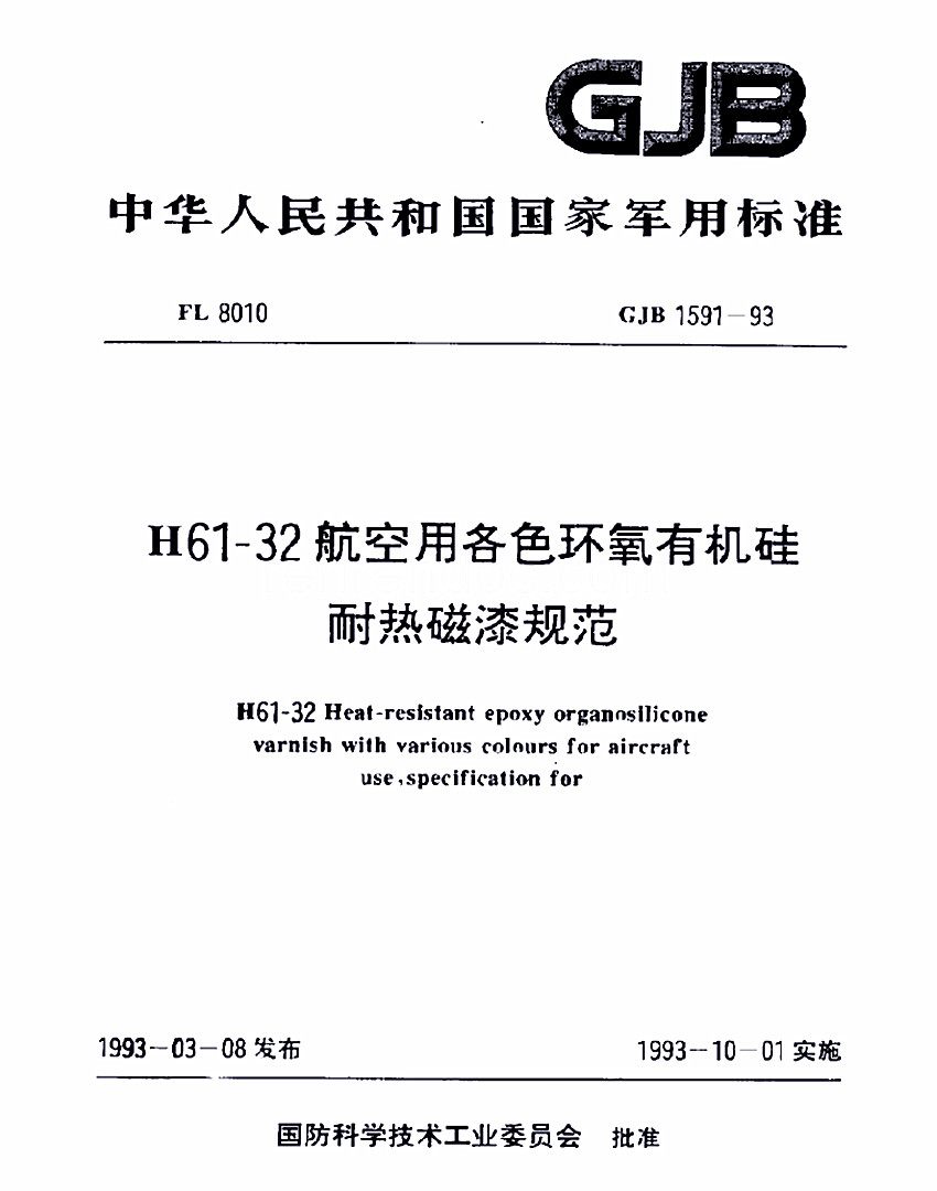 H61-32各色環(huán)氧有機(jī)硅耐熱磁漆標(biāo)準(zhǔn)GJB 1531- 93 GJB 中華人民共和國(guó)國(guó)家軍用標(biāo)準(zhǔn) FL8010 GJB 1531- 93 H61- 32航空用各色環(huán)氧有機(jī)硅耐熱磁漆規(guī)范 H61-32 Heat-resistant epoxy organosilicnne vrnish with various colonrs fnraircrufl use speciflc