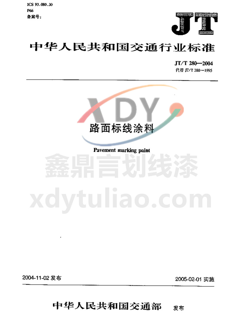 JT/T 280-2004路面標(biāo)線涂料標(biāo)準(zhǔn)是防腐涂料小編照搬JT/T 280-2004《路面標(biāo)線涂料》紙質(zhì)版內(nèi)容,大家可以放心參考。更多防腐涂料執(zhí)行國(guó)家和行業(yè)標(biāo)準(zhǔn)等防腐涂料相關(guān)信息可以參考官網(wǎng):m.wzyahu.com.cn ICS 93.080.30 P66 JT 中華人民共和國(guó)交通運(yùn)輸行業(yè)標(biāo)準(zhǔn) JT/T 280-2004路面標(biāo)線涂料Pavement